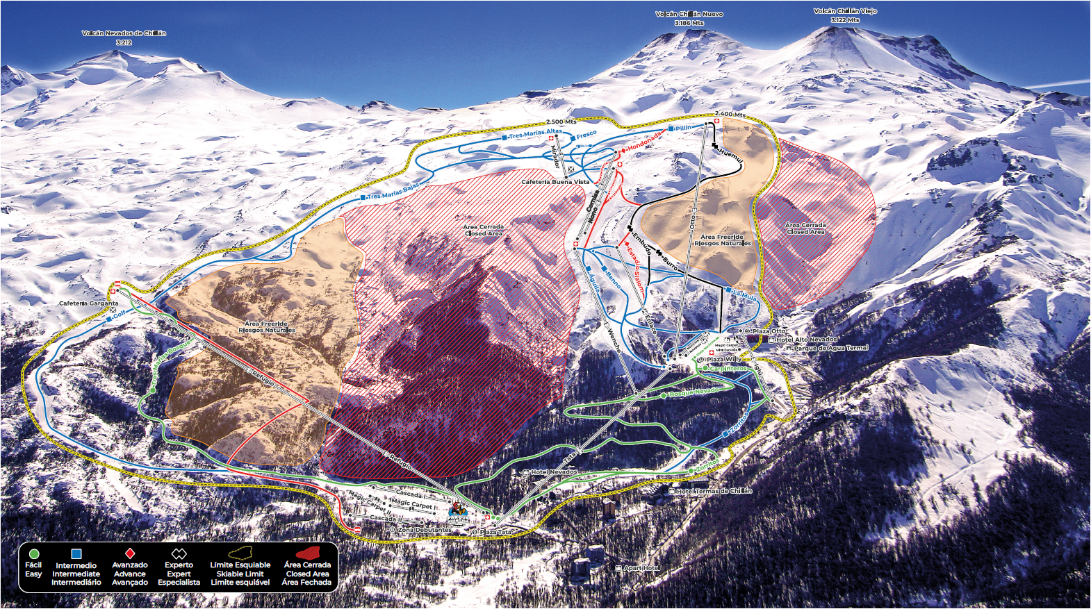 Intermediate skiers and riders will technically unlock access to all of Nevados de Chillán's terrain areas. The resort’s blue-square runs provide enjoyable cruising terrain, all of which is consistently groomed. It's especially worth noting the very long top-to-bottom Tres Marías/Golf run, which spans the resort's entire vertical drop through especially remote areas and offers some of the most unique views at the resort, especially near the top in its above-treeline part. However, it's worth noting that this long, roundabout route is the only blue route down from the resort summit—and that this trail doesn't return to the main base without a lift ride from the lower mountain—so guests will need to try something more challenging if they want something more direct.