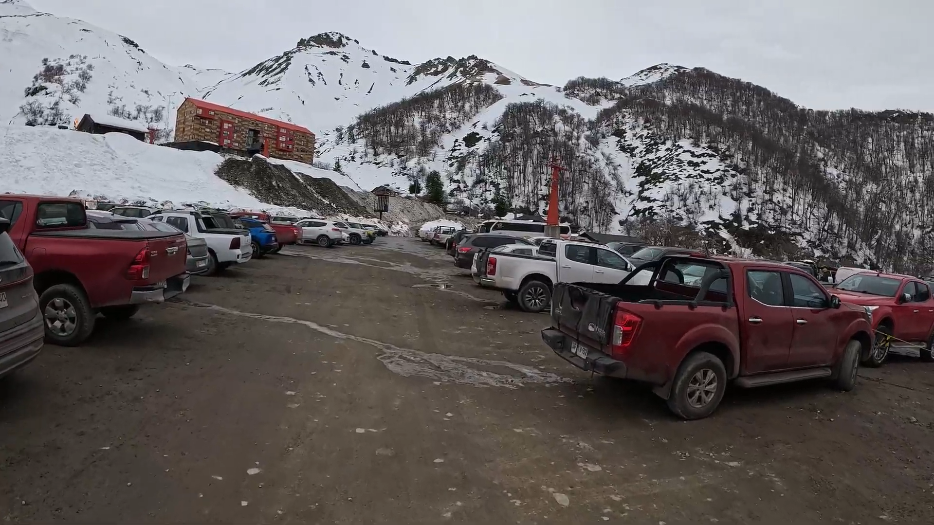 Cars parked below snowy mountains at Nevados de Chillan ski resort