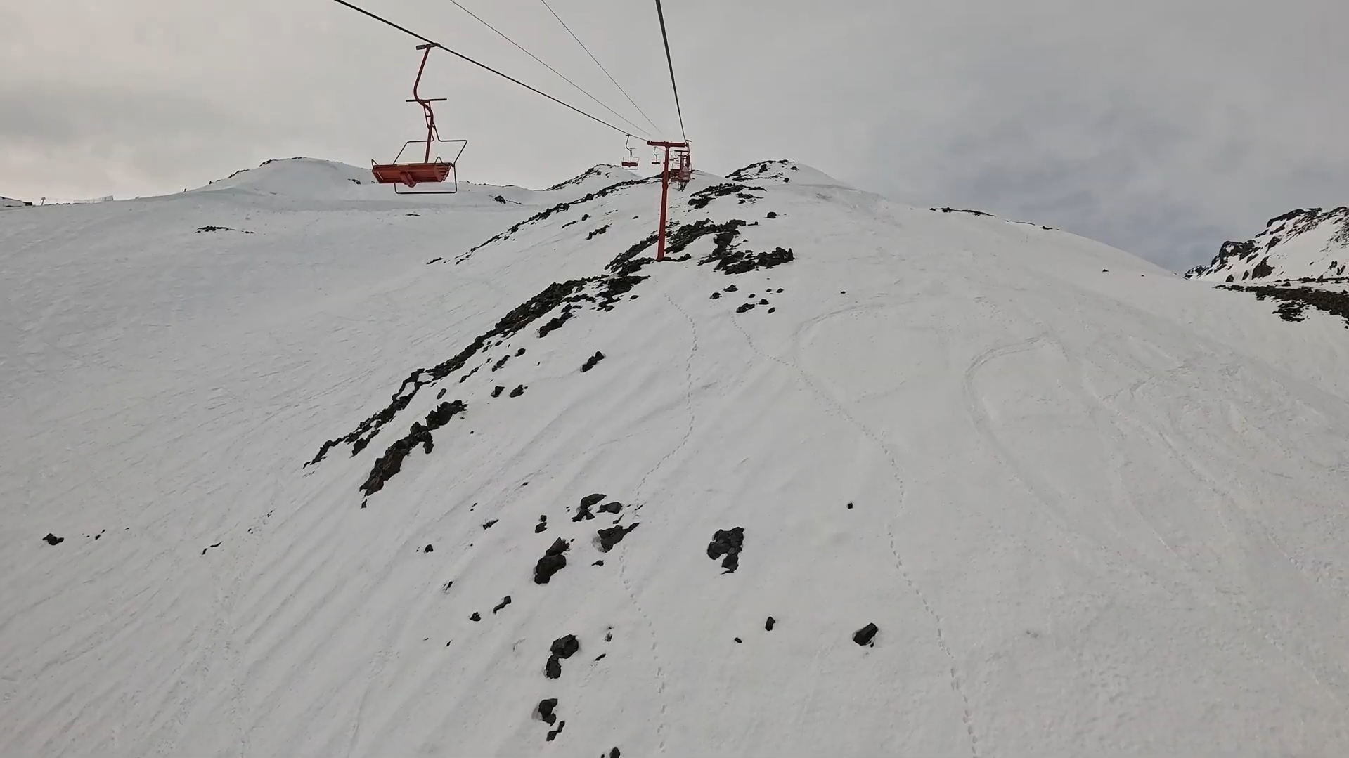 Old double chairlift going up a steep mountain with rocks and no trees at Nevados de Chillán ski resort