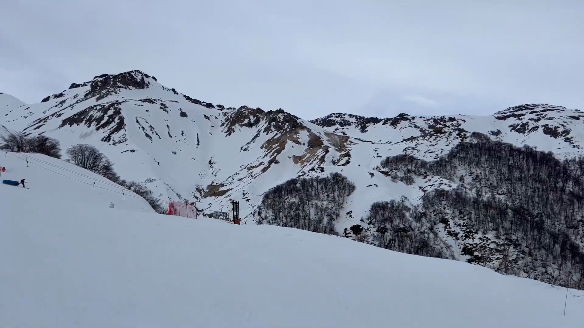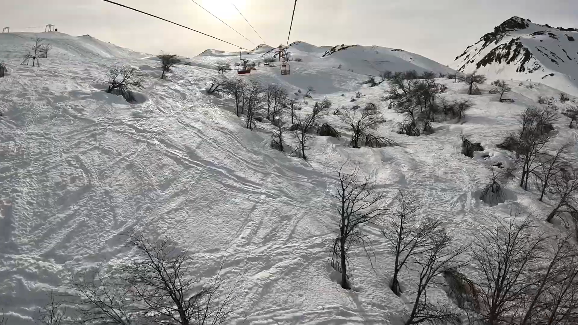 Nevados de Chillan chairlift view of tall volcano mountains and shrubby trees