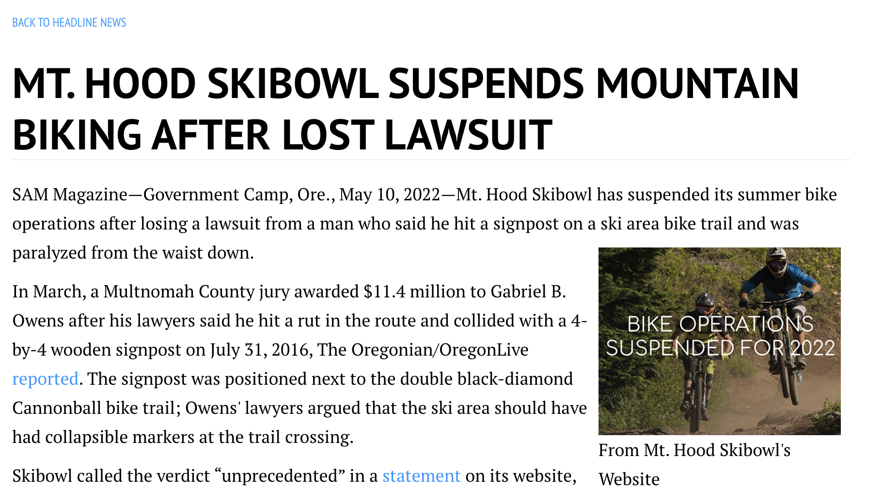 The first major post-Bagley case took shape in 2016, when a mountain biker at Mount Hood Skibowl was paralyzed after hitting a drainage rut and colliding with an unpadded wooden post along a downhill trail. Although the incident occurred during the summer, not the winter season, the case had major implications for the liability environment surrounding outdoor recreation in Oregon. In 2022, a jury awarded the rider over $11 million in damages, ruling that Skibowl had failed to take reasonable safety precautions despite signage and waiver protections. It was one of the largest single verdicts against a recreation operator in Oregon history, and in response, Skibowl completely shut down their bike park operations and hasn’t restarted them since.