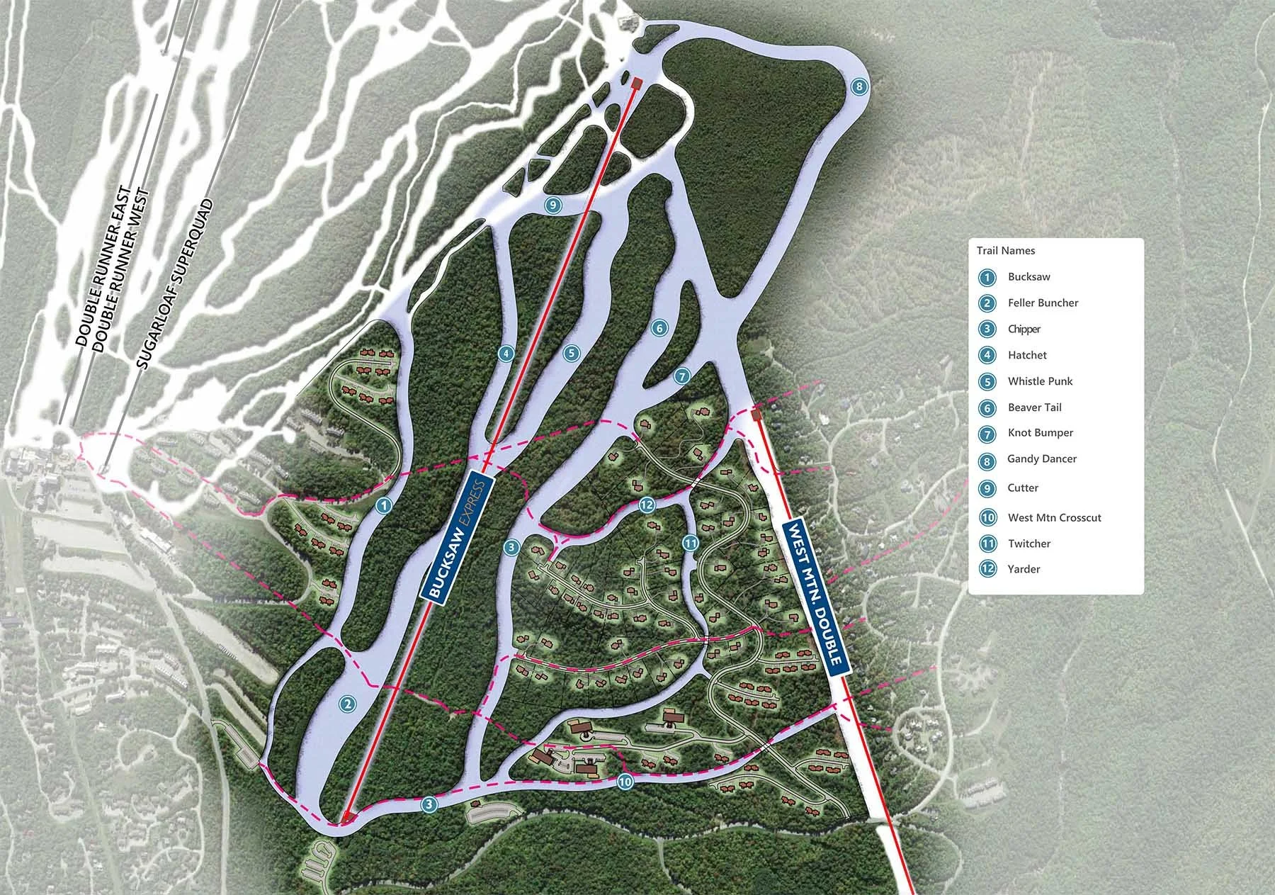 Maine’s Sugarloaf ski resort is seeing a major expansion for the 2023-24 season, according to a release from the mountain this morning. As previously hinted at in its Sugarloaf 2030 master plan, the resort is adding a brand new high-speed quad—named the Bucksaw Express—and adding 12 new trails of beginner and intermediate difficulty in the currently undeveloped West Mountain zone. The new Bucksaw chair will top out where the West Mountain Double currently ends, and will provide access to the mid-mountain Bullwinkle’s Restaurant. The existing West Mountain lift, which really only serves one parking-access trail, will be shortened to “eliminate redundancy and congestion at the unload area”.
